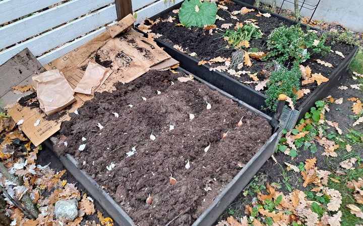 Lavatkin pistin uusiksi ja muutin sieltä löytyneet kuunliljat piha-aidan ulkopuolella olevaan myöskin villiintyneeseen kukkapenkkiin. Kitkin molemmat lavat kunnolla juurista ja upotin omenapuun oksia silputtuna pohjalle. Raparperin siirsin vain lavasta toiseen, mutta säästin sen yrttilavan puolelle. Vasemmasta lavasta tuli ’kasvimaa’, johon syksyllä 2022 istutin jo valkosipulia varaten pienen alueen tämän kauden herneille.
