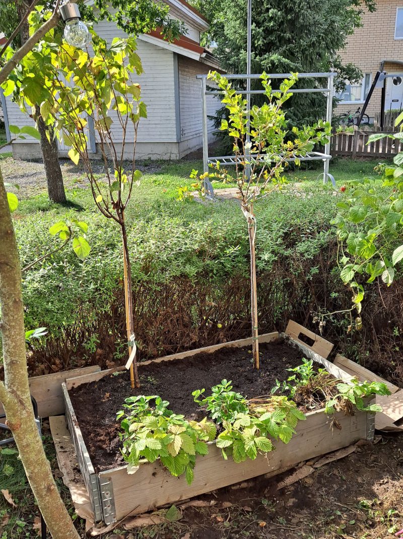 Laajensin istutusalueita myös nurmikon puolelle istuttaen nurkkaan matalan pensasaidan viereen rungollisen mustaherukan ja karviaisen kuukausimansikoiden kera. Se on yksi puutarhan aurinkoisimpia kohtia ja rungolliset pensaat eivät jää pensasaidan taakse. Samalla marjapensaat tarjoavat lisää näkösuojaa naapureihin nähden, kun rivarissa naapurit ovat lähellä ja kulkureitti kulkee pihamme vierestä.