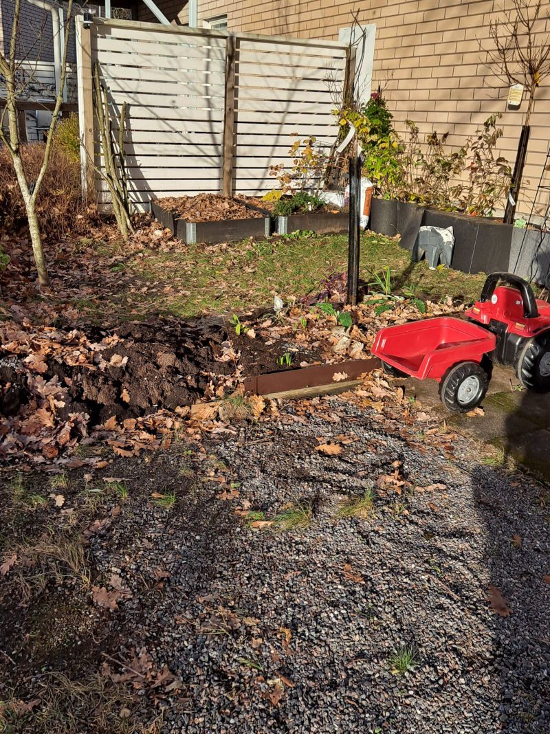 Kesäkukkaruukkujen tyhjentämisestä kippasin mullat vielä uuden istutusalueen jatkoksi ja sinne en jaksanut enää istuttaa edes tulppaaneja syksyllä, joten se odottaa nyt touko-/kesäkuuta ja daalioiden juurakoita.