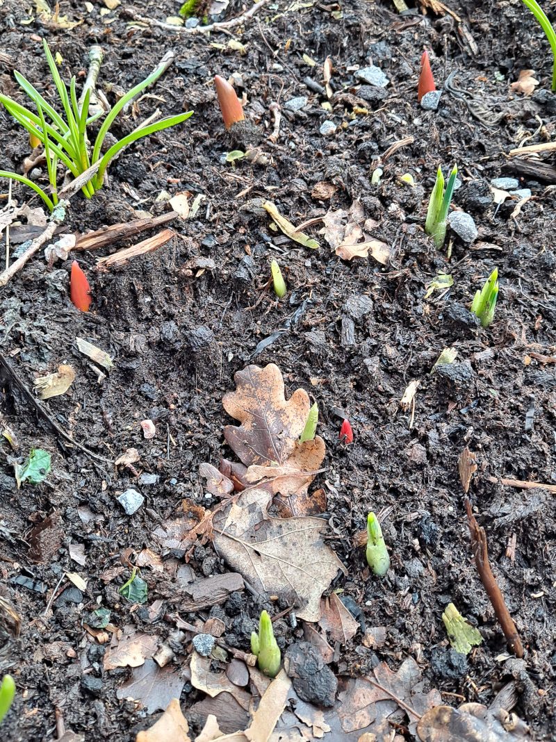 Syksyn ahkera kukkasipulien istutus alkaa myös tuottaa tulosta, sillä piippoja on noussut jo runsaasti esiin sekä keskellä pihaa että aidan ulkopuolella olevassa kukkapenkissä.