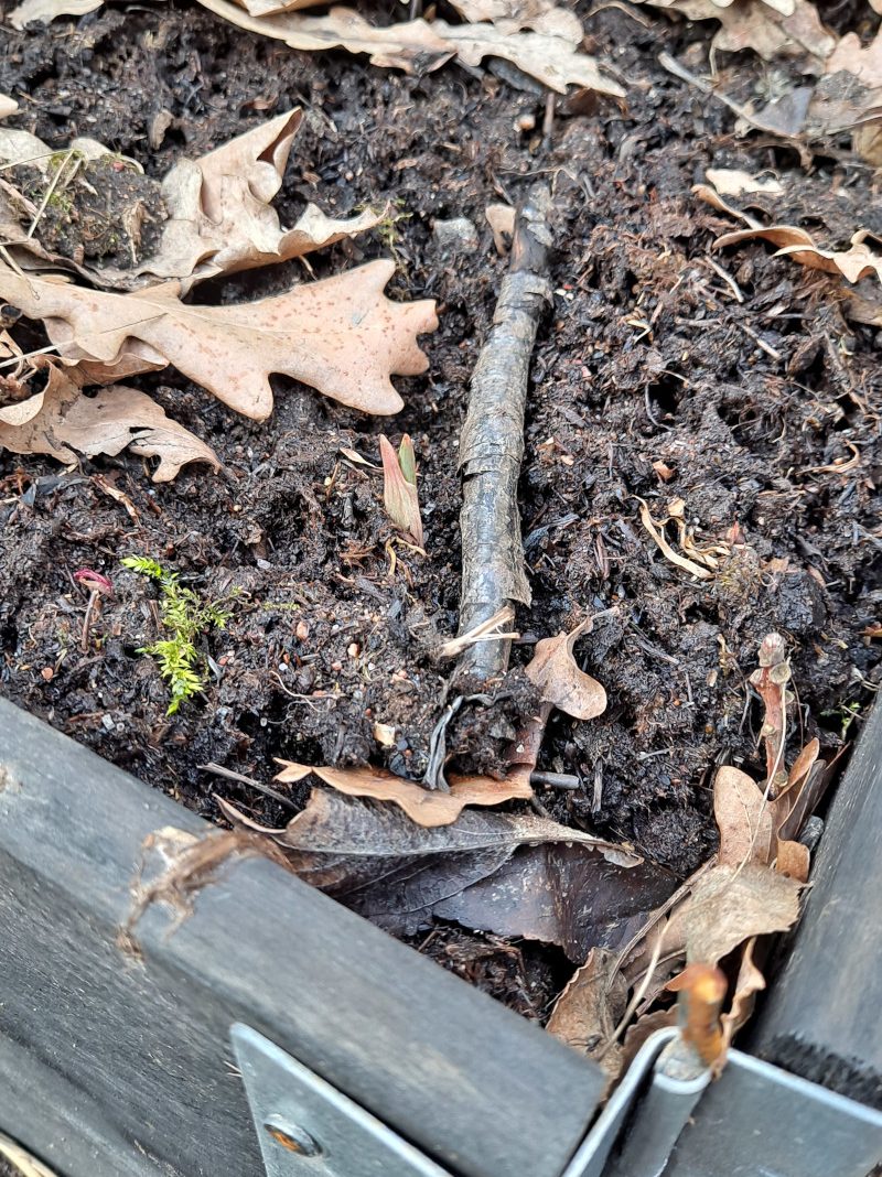 Myös valkosipulilavassa näkyy jo elämää kohdissa, joissa lehdet eivät enää peitä multaa.
